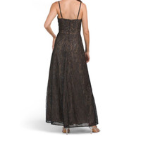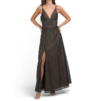 Details & care A floral lace overlay furthers the enchanting style of a sleeveless gown fashioned with a dramatic side slit. • 60" length • Back zip closure • V-neck • Adjustable straps • Side slit • Lined • Machine wash, dry flat • Imported • Item #10179798 Size Small New without tags. Never worn or tried on. In stores now for $278.