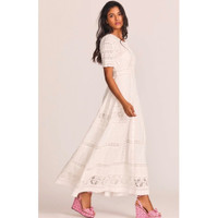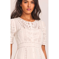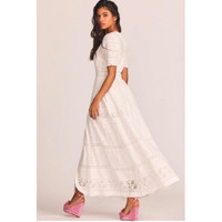 Romantic and timeless, the LoveShackFancy Kylen Maxi Dress is crafted from soft ivory cotton lace with intricate Victorian-inspired details. This silhouette features a button-front design, lace-trimmed short sleeves, and an elegant empire waistline. Finished with mother-of-pearl buttons and delicate paneling, this piece blends feminine charm with modern ease. Perfect for bridal events, garden parties, and special occasions. ⸻ ✨ DETAILS • Style: Kylen Victorian Lace Maxi Dress • Color: White / Ivory • Fabric: 100% Cotton • Short sleeves with lace trim • Partial lining • Button-front silhouette • Empire waistline • Mother-of-pearl button detail • Maxi length • Dry clean only • Size: 2 • Condition: New With Tags • Original retail: $595