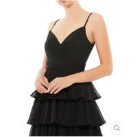 A romantic and feminine midi dress from Mac Duggal featuring a soft V-neckline, ruched bodice, and tiered ruffle skirt for elegant movement. Finished with delicate spaghetti straps and a flattering pleated cummerbund waist, this dress is perfect for cocktail parties, weddings, and special occasions. Details • Style: 55437 • Color: Black • Sheer chiffon overlay; 100% polyester lining • Fully lined through body • V-neckline with spaghetti straps • Ruched bodice + pleated cummerbund waist • Layered ruffle skirt • Concealed back zipper Size: 0 Condition: New with tags Retail: $258