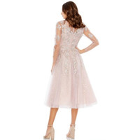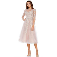 Mac Duggal 30681 vintage lilac evening dress is styled in beaded floral embroidery on allover lace, with a sheer bateau neckline and illusion long sleeves. This tea-length A-line dress finishes in a zipped-up back and a gorgeously flared skirt. Mesmerize everyone in this charming creation by Mac Duggal 30681. Exceptionally ornate with floral embroidery and beads accents on a sheer lace bodice, this charming dress features an illusion bateau neckline and sheer long sleeves with zippered closure. Designed with a sheer full back, the skirt elegantly flares an A-line silhouette that runs at tea-length hemline. This Mac Duggal cocktail dress will let you celebrate that divine feminine beauty! Model is wearing the Vintage Lilac color. Size 4 Measures 15.5" across the chest. Measures 13" across the waist. New with tags Retail $598