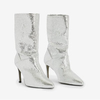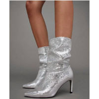 AllSaints Orlana Shimmer Boots Add some shimmer to your easy-going lifestyle by wearing AllSaints™ Orlana Shimmer Boots. Made of leather upper, the boots have embossed metallic detailing. The calf-length boots feature a pointed toe and stiletto heel. Leather lining and goat leather insole ensure comfort with durability. • Tunit outsole. • Made in Spain. • Product measurements were taken using size 7, width M. Please note that measurements may vary by size. • Measurements: • Heel Height: 3 ⅐ in • Circumference: 13 in Silver Size US 8 New without box $349