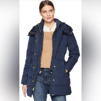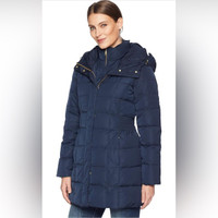 Upgrade your puffer coat style with our 32' Signature Hooded Taffeta Down Coat, featuring a box-quilted design in rich toned taffeta. The elastic waist ensures a perfect fit, while the dramatic oversized hood and bib front add a bold (and cozy) statement to your winter look. When the temperature drops, this coat is everything. STYLE #T10119 32" taffeta hooded down coat. Insulated with 100% polyester down alternative. Bib front and elastic side waist detail. Zip pockets. 100% polyester. Brushed gold hardware. Zip front closure. Adjustable drawcord at hood. Imported Machine wash cold or dry clean. Navy in color Size Small There is a small defect on the inner left side of the sleeve. Not noticeable, but priced accordingly. Please see photo. New without hang tags