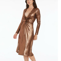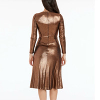 Metallic shine keeps all eyes on you in this long-sleeve knit dress in a classic fit-and-flare silhouette with a softly gathered waist. 44 1/2" length (size Small) Hidden back-zip closure Deep V-neck Long sleeves Lined 95% polyester, 5% spandex Machine wash, dry flat Imported Metallic Bronze in color The hang tag fell off but it is new and never worn. Size Small $248