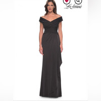 Luxurious long jersey gown with slight off the shoulder top and ruching. Flattering waist and ruffle detail along skirt. Back zipper closure. Ruched Wrap-Around Sleeve Column Silhouette Dress by La Femme Look absolutely beautiful in this classy and chic outfit designed by La Femme 30040. The lovely dress has an off shoulder design with ruched details following the torso. The natural waist bodice has a wrap-around detail on the waist too to give an illusion of slimmer waist. The column silhouette shows ruffle details on the side of the skirt featuring a full-length hem and a sweep train. Black in color Size 6. Measures approximately 16” across the chest New without hang tags $438