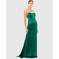Gorgeous satin gown accented with shimmering crystal-encrusted straps and a sweeping train. Style # 12428 leena for Mac Duggal 100% Polyester Lined Scoop Neck Thin Crystal Straps Zipper Full Length Emerald Green in color Size 6 New without tags Never worn $398