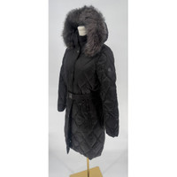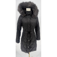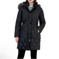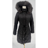 Zipper pockets at front Attached faux-fur-trimmed hood; stand collar; zipper closure with snap overlay at front Lined Removable belt Water resistant Machine washable Shell and lining: polyester; faux fur hood trim face: modacrylic; faux fur hood trim back: polyester; body and sleeve fill: down/waterfowl feathers; hood and collar fill: polyester Black in color Removable hood Size XS Measures 19" pit to pit Measures 37" in length New with tags $360