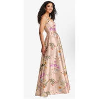 Alfred Sung Floral Corset Satin Gown in Butterfly Botanica-Pink Sand Sz 14 $302 Details & care Side boning shapes and supports the bodice of this lustrous satin gown designed in an A-line silhouette and covered with romantic blooms. • 60" length • Square neck • Sleeveless • Lined • 100% polyester • Dry clean or hand wash, line dry • Imported • Item # 7538061 New with tags Size 14 Measures 20" across the chest Measures 17.5" across the waist New with tags $302
