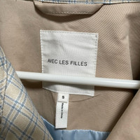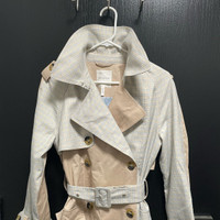 Avec Les Filles Combo Plaid Belted Double-Breasted Trench Coat Size Small Color Beige/Cream/Blue Condition New With Tags • long sleeves with adjustable cuffs • double-breasted button closure • removable-belt • flap pockets at front • notched collar • shoulder epaulettes • vent back • unlined • Cotton-Blend • Machine Wash