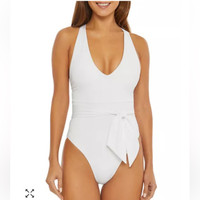 Rebecca Virtue Color Code Belted One Piece Swimsuit FEATURES • Plunging V-neck with removable soft cups • Adjustable straps with crisscross back and self-ties • Self-tie waist sash • Lined • Full bottom coverage • Imported MATERIALS & CARE • Polyester/spandex; lining: nylon • Hand wash White in color Size Medium New with tags $148