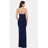 Description へ Jewel straps jazz up this pretty halter neck gown from Betsy & Adam. Product Details Zip closure Halter neck Sleeveless Lined Imported Product Specifications 62 in Length Material & Care Polyester, spandex Dry clean only Midnight blue in color (almost black) Size 14 Measures 19" across the chest New with tags $249