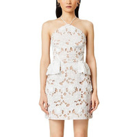 Elliatt Seafarer Lace Halter Neck Mini Dress Halter neck with back tie closure Sleeveless Back zip closure Mini silhouette Peplum ruffles at hips Allover floral lace Approx. 33.5" from high point shoulder to hem, based on a size small Size XS Measures 16" across the chest Measures 13" across the waist New with tags! Retail $319