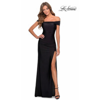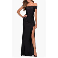 La Femme 28506 Off the Shoulder Dress with Tie Back and Slit Black Sz 4 $348 Floor length jersey gown with flattering off the shoulder bodice. This design features a wide strap criss cross open back that is sure to wow any crowd. A sultry side leg slit brings everything together. Back zipper closure. • 61" length (Size 4) • Adjustable back tie closure; hidden back-zip closure • Off-the-shoulder neck • Dipped back with crisscrossing straps • Full-length column skirt with front thigh-high slit • Lined • 100% polyester • Spot clean • Item # 10641529 Black in color Size 4 New with tags $348