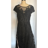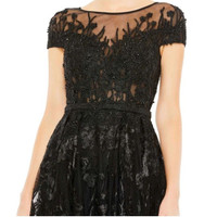 Be a vision in this masterfully crafted gown styled with a partially sheer, short-sleeve bodice, twinkling embellishments, and floral silhouette embroidery. Cut in an elegant A-line shape, the beautiful gown ensures you top the best-dressed list at any formal event, gala or wedding. Mac Duggal Hand embellished floral embroidered overlay; 100% polyester lining Partially lined bodice and sleeves; fully lined skirt Illusion boat neckline Short cap sleeves Satin waist detail Allover heat-set jewel encrusted embellishments Bust cups Concealed back zipper Approx. 62.5" from top of shoulder to bottom hem 18" pit to pit Available in Black Style #20405 Size 10 New with tags $798