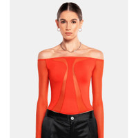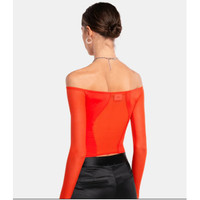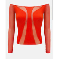 Elevate your style with the SWIRL Blouse, boasting elegant mesh cut-outs and a flattering off-shoulder fit. This stunning piece is perfect for styling with a pair of jeans or a skirt, creating the ideal look for a night out. Info: • 90% polyester, 10% spandex • Off the shoulder styling • Unlined • Machine wash (mild detergent, iron, no bleaching, dry flat, do not tumble dry) Red in color (looks red/orange) New with tags