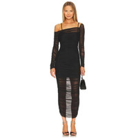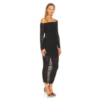 Description Sheer midi dress with slip included and ruched detailing throughout. One shoulder spaghetti strap. Shown here in Black. 90% Nylon, 10% Spandex Made in China Model is 5'10" wearing size S *undergarment included* Style No. 3479-17 Black in color Under slip is included New with tags XS $278