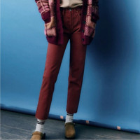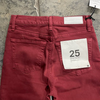 The Ultra High Rise Stove Pipe Jean in Washed Burgandy is our version of the classic 70s-inspired straight leg jean with a higher rise and cropped inseam teatures. Features a faded, grungy earth-toned wash in comfort stretch fabric, classic button fly and raw hem. Ultra high rise fit sitting at the natural waist and hitting at the ankle bone. Fitted through thigh with a straight leg down to your ankle. Made in the USA 98% Cotton, 2% Elastane Burgundy in color Size 26. Waist measures 13.5”. Rise 10.5”. Inseam 27”. New with tags! Size 25