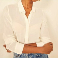 NEW REFORMATION Ivory White VIOLET Semi-Sheer Button Front Blouse Top Shirt Size: Medium Color: Ivory - White A work-ready blouse with an airy fit is perfect for work or play. Front covered-button closure. Spread collar. Long sleeves. Bust: 18" pit to pit 100% viscose, Dry clean. Made in the USA of imported fabric or imported. New with tags $128