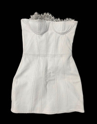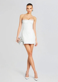 Retrofete AMBERLY LEATHER DRESS in Optic White Sz XS $698 The Amberly Dress is a strapless stunner designed to enhance your confidence while turning heads with its unique reptile leather texture, ultra flattering fit and alluring lace accents. Shown here in White. • 100% Reptile Leather • Made in India • Style No. SS24-8638 Neckline to hem measures approx 22.5" in length Size XS New with tags