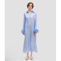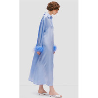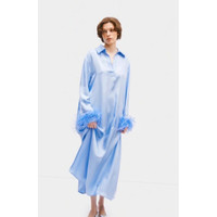 The Sleeper Luna Maxi Dress is a versatile day-to-evening piece crafted from soft, breathable EcoVero™ rayon. This effortless silhouette features a relaxed fit, classic collar, concealed front placket, and statement detachable ostrich feather cuffs for a chic, playful finish. Perfect for resort wear, dinner outings, or elevated everyday styling. Details • Color: Blue • Fabric: EcoVero™ rayon (STANDARD 100 by OEKO-TEX® certified) • Loose, flowy silhouette • Classic collar with concealed front placket • Long sleeves with detachable ostrich feather cuffs • Maxi length • Size: XS (oversized fit) • Approx. measurements: 21" pit to pit • Condition: New with tags • Retail: $450