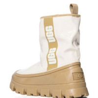 UGG Classic Brellah Mini Waterproof Bootie is made from a water repellent patent upper and features a rounded toe silhouette, cozy, upcycled wool lining, a mid calf-height shaft, UGG logo side paneling, a recycled polyester back pull tab, a pull-on fit, and a chunky rubber flatform sole. - Patent upper - Upcycled wool lining - Rounded toe - Flatform sole - 7.55" shaft height - 1.5" flatform sole height New with tags, no box. Retail $170