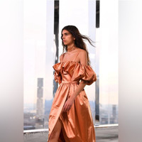 The Lelita Dress is cut from beautiful Italian suiting that's been treated with a glossy chintz finish and dyed a gleaming copper hue. This elegant silhouette teatures cloud-like sleeves which expand across the fitted bodice, a textured contrast to the tulip shaped skirt. This midi-length dress is finished with a hidden side-seam zipper. Composition: 53% Cotton, 47% Acetate; Lining: 100% Polyester Approximately 43 Inches in Length Dry clean Size 4 Measures 16” across the chest. New with tags! Retail $1,240
