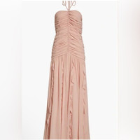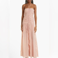 Channel your inner goddess in this blush-hued silk dress made with a dreamy ruched bodice and a braided halter strap tracing down to a ruffle-frothed skirt. Dress silk-crepon braided. Trims ruched ruffled ties. Back concealed Hook And Zip Fastening. Internal Boning. Fully Lined. Lightweight. Non-stretchy. Halter neck. Sleeveless, with cutaway shoulders. 100% silk. Dry clean. Imported. Size 6 Measures approx 17” across the chest. Blush in color New without tags Retail $958