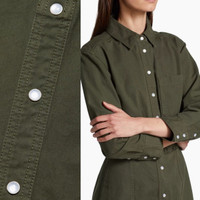 Details Veronica Beard's Keston dress is crafted of cotton twill and boasts shirt-inspired detailing. This style is complete with silvertone snap buttons and a rounded hem. Point collar Long sleeves Chest patch pocket Button-front closure 100% cotton Dry clean Imported SIZE & FIT About 36.25" from shoulder to hem Size 12 Pit to pit 22" Army Green New with tags $398
