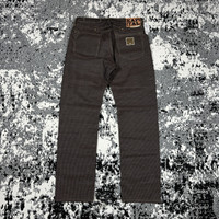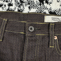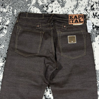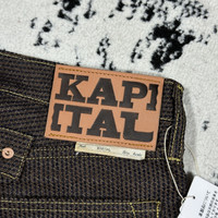 KAPITAL CENTURY DENIM 5P MONKEY CISCO JEANS Five Pocket with Cinch Back No. 5-S KAP-301A COLOR : BROWN INDIGO SIZE : 36 CONDITION : BRAND NEW VERY RARE PIECES WITH THIS CONDITION! Kapital’s precisely hand-sewn denim with Indigo dye creates a strong stitch between fabrics, responsible for a centurial lifespan. A restructured Cisco fit includes a comfortable high-rise fit with a back buckle, allowing you to wear your denim with a cinched waist. The timeless denim is made specifically for you. •Color: No.7-S / Sumi (Charcoal) x Indigo •Fabric: Sumi Dyed Denim With Indigo Sashiko •100% Cotton •Mid Rise Regular Straight Fit •Cinched Back •Button Fly •Unwashed Sanforized Denim, 3% Shrinkage •Made In Japan •Style #: KAP-301A Measurements : Waist : 46(92) cm Length : 115 cm Open leg : 22 cm Measurements taken by seller with item in hand. Measured with garment laid flat
