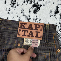 KAPITAL CENTURY DENIM MONKEY CISCO JEANS Five Pocket with Cinch Back No. 5+S FRONT ZIP KAP-76 COLOR : KHAKI BROWN SIZE : 32 CONDITION : LIKE A NEW 1X WORN VERY RARE PIECES WITH THIS CONDITION! The Kapital Monkey Cisco Jeans made out of the iconic Century Denim combines traditional Japan with the modern West. The No. 5+S denim is dyed with indigo and kakishibu (juice of the persimmon). In addition, the denim is reinforced with indigo dyed sashiko stitched cotton yarn, which looks decorative and gives the denim its unique appearance. When washed, the different dyes mix and the denim ages in many color fades, creating a very unique patina. The cut of the Kapital Monkey Cisco Century Denim is inspired by an old Levi's® buckle back jeans, which is a slightly tapered cut below the knee with a straight bottom. Loose fitting When you order, please take one size bigger than normal. Size 30" = 28" Size 32" = 30 to 31" Size 34" = 32" to 33" Size 36"= 34" Size 38"= 36" to 37" * Century Denim No. 5+S: Kakishibu with natural indigo dyed sashiko stitching * Buckle back * Front Zip * 5-Pocket Jeans * Made in Japan Measurements : Waist : 40(80) cm Length : 112 cm Open leg : 18 cm Measurements taken by seller with item in hand. Measured with garment laid flat flat