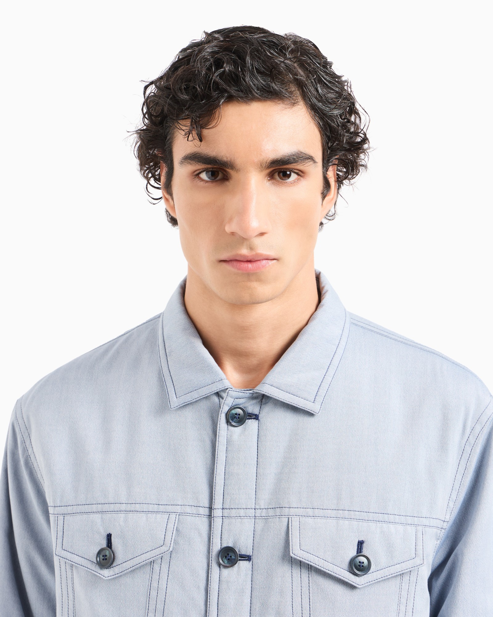 NEW WITH TAGS Product Description Blouson made of silk canvas, embellished with a print that creates a denim effect. The piece features a shirt collar, exposed button closure and flap patch pockets, details that highlight its versatile, modern spirit. The piece is part of the Holiday selection that plays with a striking colour palette, incorporating black onyx, sky blue and ivory. These shades are combined with luxurious fabrics like linen and silk, and iconic ones, like cupro and Lyocell, creating a unique experience in texture. Modern, relaxed shapes dress up different occasions with unmistakable Giorgio Armani style. Composition Fabric: 100% silk (mulberry) Padding: 100% polyester Lining: 100% cupro Details Shirt collar Exposed button closure Two patch pockets with flap and button Two snap-button side pockets Single-buttoned cuffs Unlined Length: 66 cm Made in Italy Product code GM001750TE16194U9289