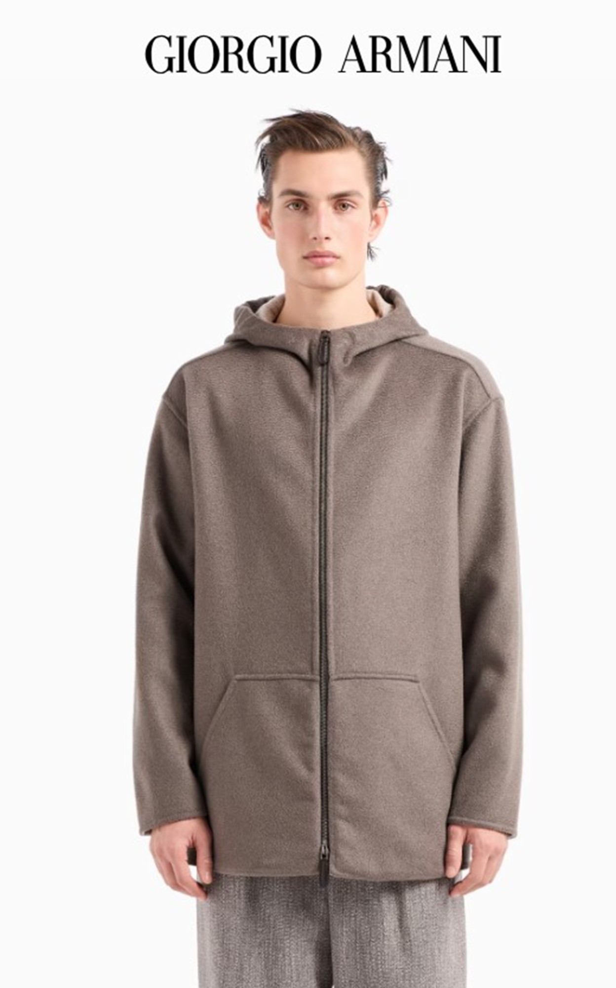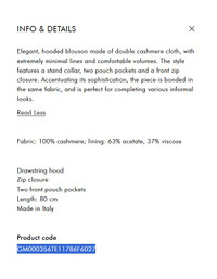 100% ORIGINAL AUTHENTIC GENUINE Giorgio Armani Caban JACKET FROM 2024 Runway COLLECTION BRAND NEW WITH TAGS Giorgio Armani is synonymous with refinement and simplicity, two things that are immediately apparent on first sight of this Caban Hooded blouson in double cashmere Giorgio Armani's long dove-grey cashmere jacket featuring an adjustable drawstring hood, front zip, dropped shoulders, kangaroo pockets and beige interior. DESCRIPTION Single-breasted jacket made of lambskin nappa leather with an extremely soft, comfortable feel. The style, with double placket closure, patch pockets and flap pockets, is bonded with a special foil that allows the garment to be left unlined, keeping its deconstructed, lightweight appearance intact. Info AND Details Elegant, hooded blouson made of double cashmere cloth, with extremely minimal lines and comfortable volumes. The style features a stand collar, two pouch pockets and a front zip closure. Accentuating its sophistication, the piece is bonded in the same fabric, and is perfect for completing various informal looks. Fabric: 100% cashmere; lining: 63% acetate, 37% viscose Drawstring hood Zip closure Two front pouch pockets Length: 80 cm Made in Italy Product code GM000356TE11786F6027