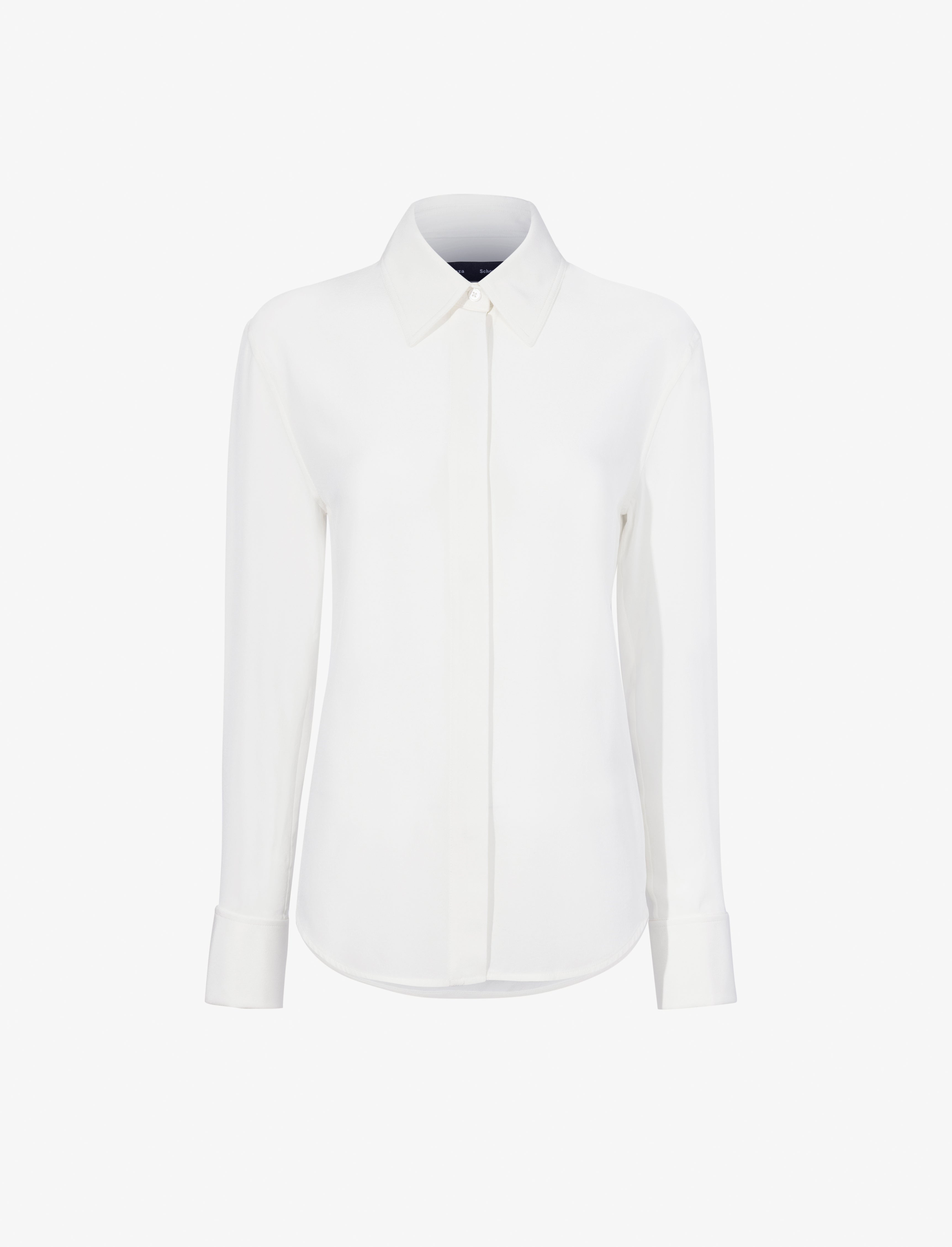 Details - White - Point collar - Long sleeves - Concealed button placket - Monogram button detail - Curved hem - Straight silhouette - 100% silk - SKU: R2514024BS177100 Size & Fit - Model is 5'11'' with 31'' bust / 36'' hips. Wearing size 4 Care - 100% silk - Dry clean only