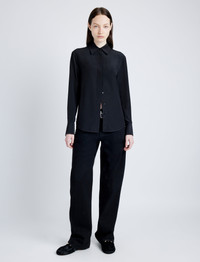 The Arabella Top in Eco Silk is tailored to a slim silhouette with a point collar. Finished with a concealed button placket and small monogram detailing at the sleeve ends. Details - Black - Point collar - Long sleeves - Concealed button placket - Monogram button detail - Curved hem - Straight silhouette - 100% silk - SKU: R2514024BS177001 Size & Fit - Model is 5'11'' with 31'' bust / 36'' hips. Wearing size 4 Care - 100% silk - Dry clean only