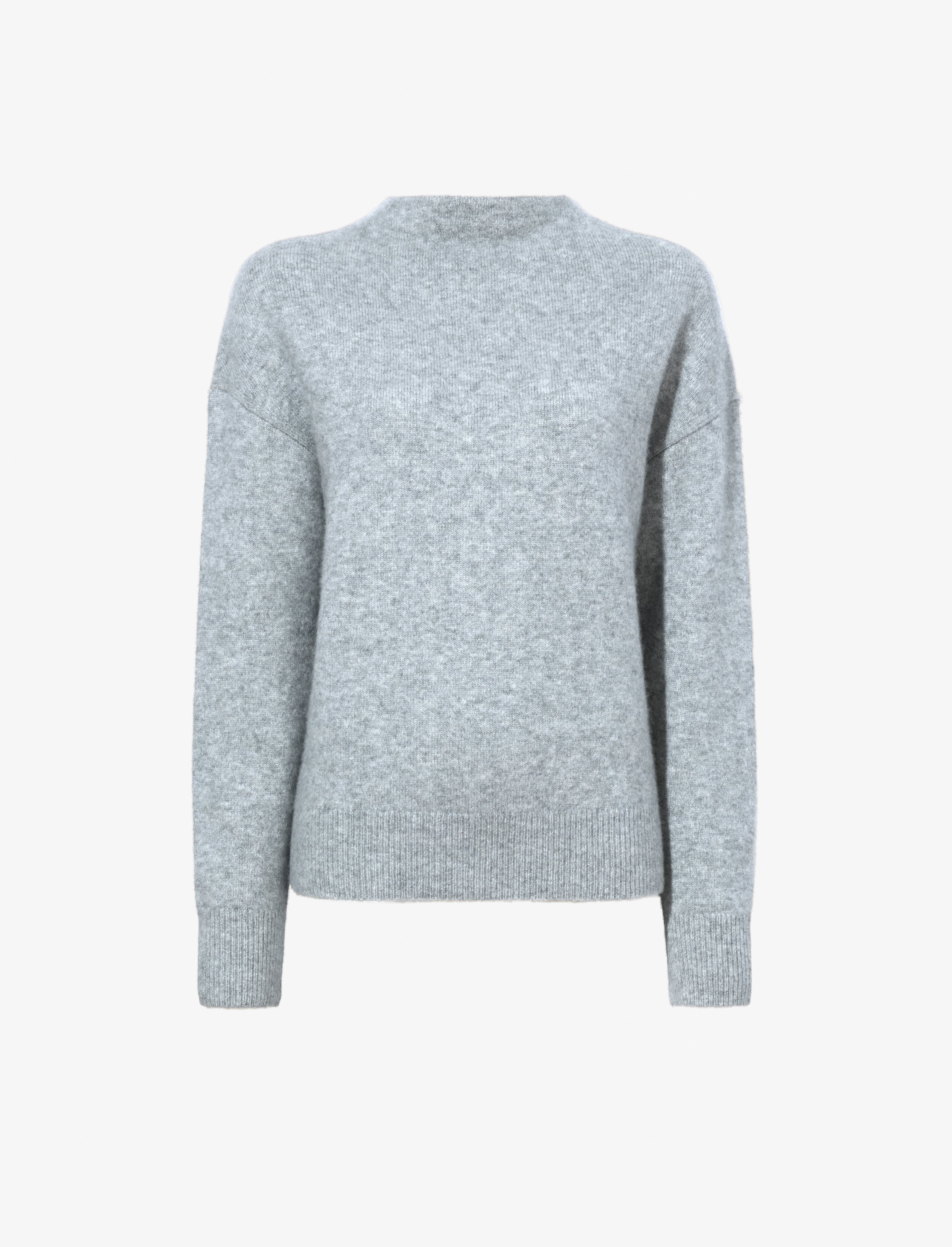 The Bria Top in Cashmere Silk is knitted to a relaxed silhouette with a mock neckline, featuring a small split at the back neck. Details - Grey melange - Mock neckline - Long sleeves - Back neck split - Relaxed silhouette - 71% cashmere, 24% silk, 4% nylon, 1% spandex - SKU: R2517221KW173031 Size & Fit - Model is 5'10'' with 32'' bust / 34'' hips. Wearing size Small Care - 71% cashmere, 24% silk, 4% nylon, 1% spandex - Dry clean only