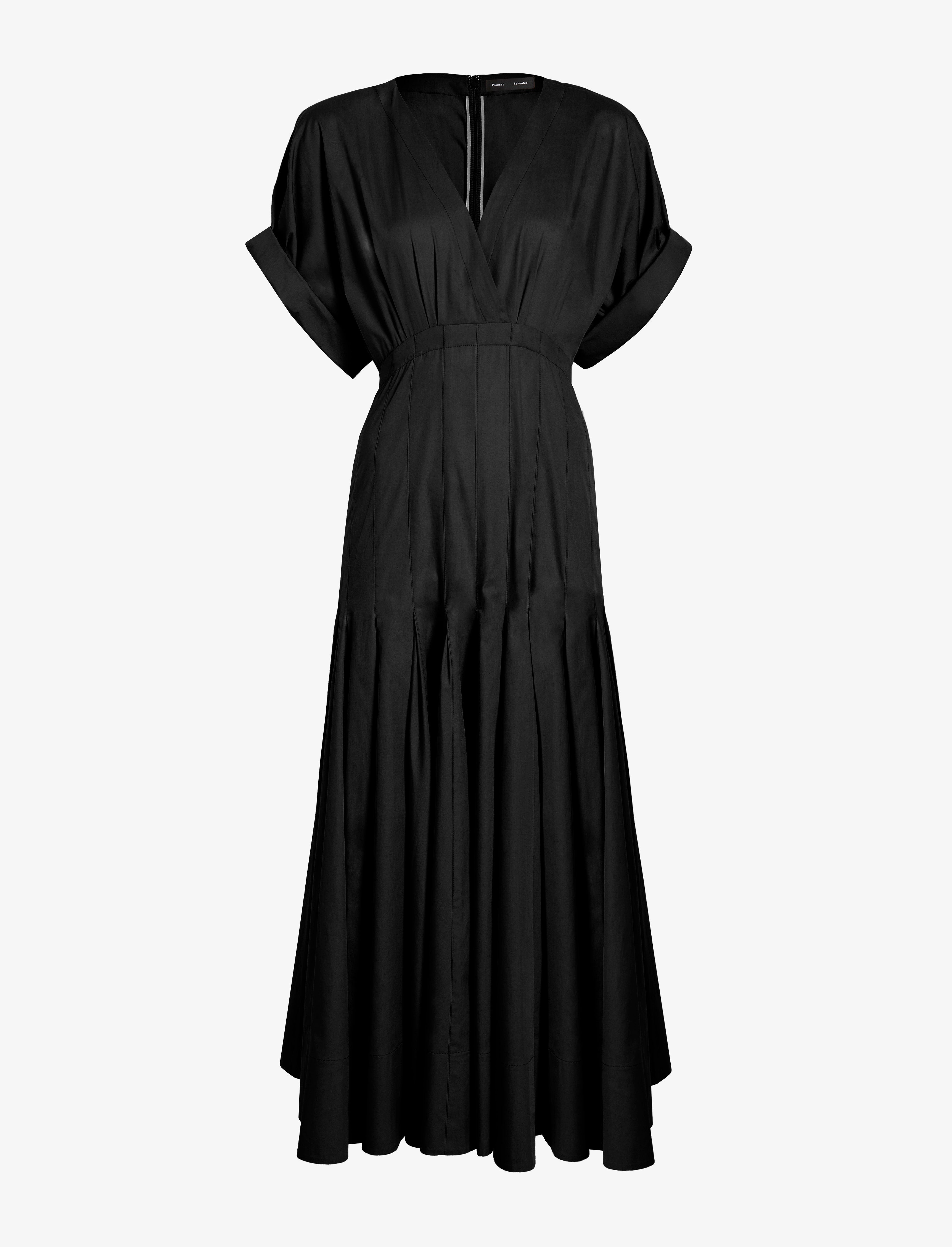 The Ciara Dress in Eco Compact Poplin is crafted to a fit-and-flare silhouette with a V-neckline and gathered waist that flows into a full, voluminous skirt. Details - Black - V-neckline - Short sleeves - Rolled sleeve hems - Voluminous skirt - 96% cotton, 4% elastane - SKU: R2533036SC083001 Care - 96% cotton, 4% elastane - Dry clean only