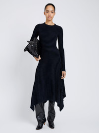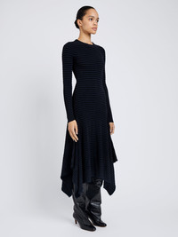 The Didi Dress in Matte Viscose Velvet Stripe is knitted to a slim silhouette with a crew neckline and finished with an asymmetric hem. Alternating textural velvet stripes add subtle dimension. Details - Navy, black - Velvet stripes - Crew neckline - Long sleeves - Asymmetric hem - Slim silhouette - 83% viscose, 17% polyester / 65% viscose, 35% nylon - SKU: R2617294KY407467 Size & Fit - Model is 5'11'' with 32'' bust / 34.5'' hips. Wearing size Small Care - 83% viscose, 17% polyester / 65% viscose, 35% nylon - Dry clean only