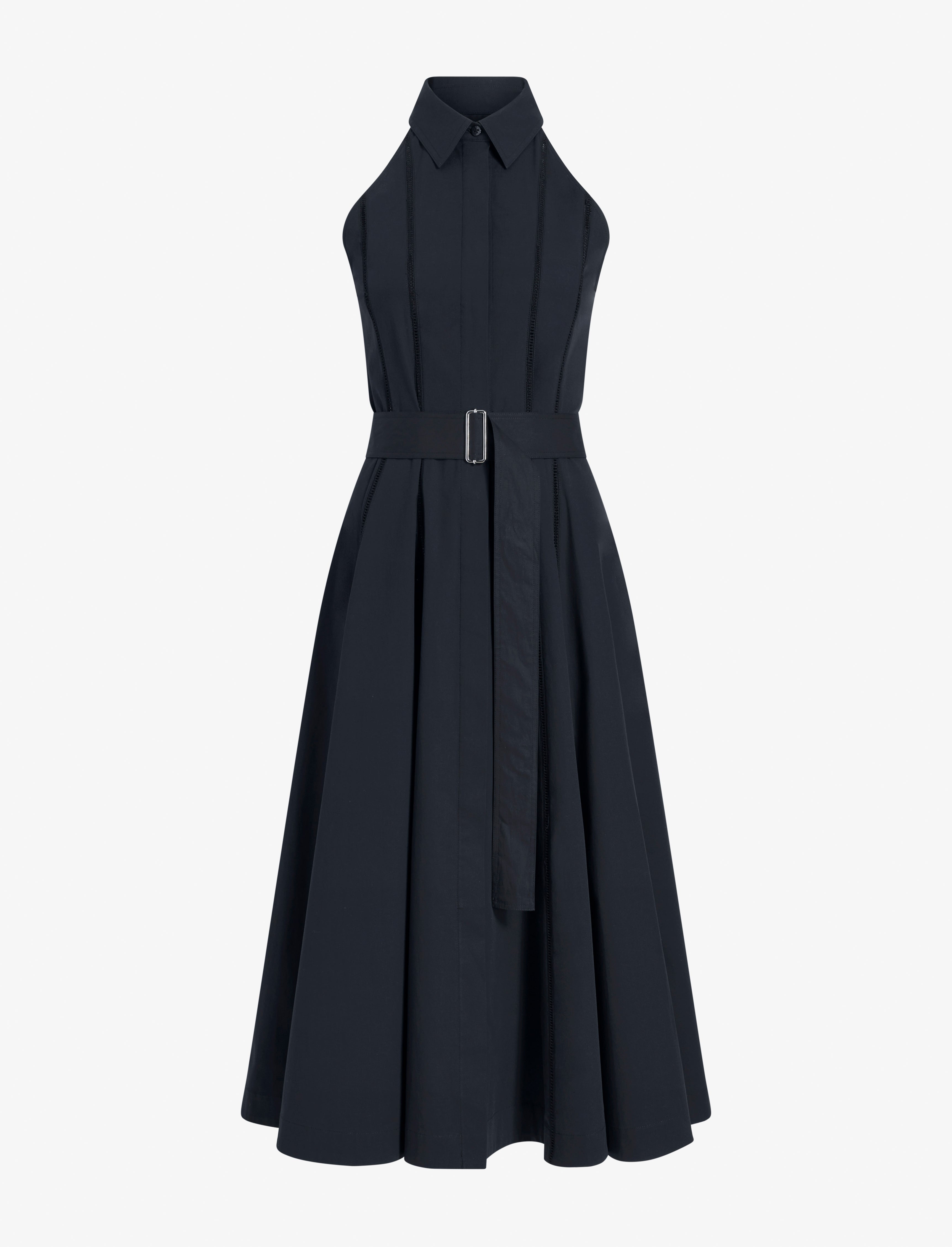 The Dorothy Dress in Eco Cotton Poplin features a high angular neck with a point collar. Detailed with eyelet trim along the bodice and includes a slider belt to accentuate the waist. Details - Black - High neck - Point collar - Sleeveless - Concealed front placket - Slider waist belt - Side slip pockets - Eyelet trim - Mid-length hem - Slim fit - 96% cotton, 4% elastane - SKU: R2533009SC083001 Size & Fit - Model is 5'11'' with 30'' bust / 35.5'' hips. Wearing size 4 Care - 96% cotton, 4% elastane - Dry clean only
