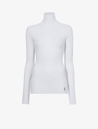 The Fox Top In Matte Viscose Rib is cut to a slim long sleeve silhouette with a straight hem and turtleneck that splits at the back neck. Details - White - Turtleneck - Long sleeve - Split back neck - Straight hem - Slim fit - 82% viscose, 18% polyester - SKU: R2447194KY283100 Size & Fit - Model is 5'10'' with 31.5'' bust / 34'' hips. Wearing size Small Care - 82% viscose, 18% polyester - Dry clean only