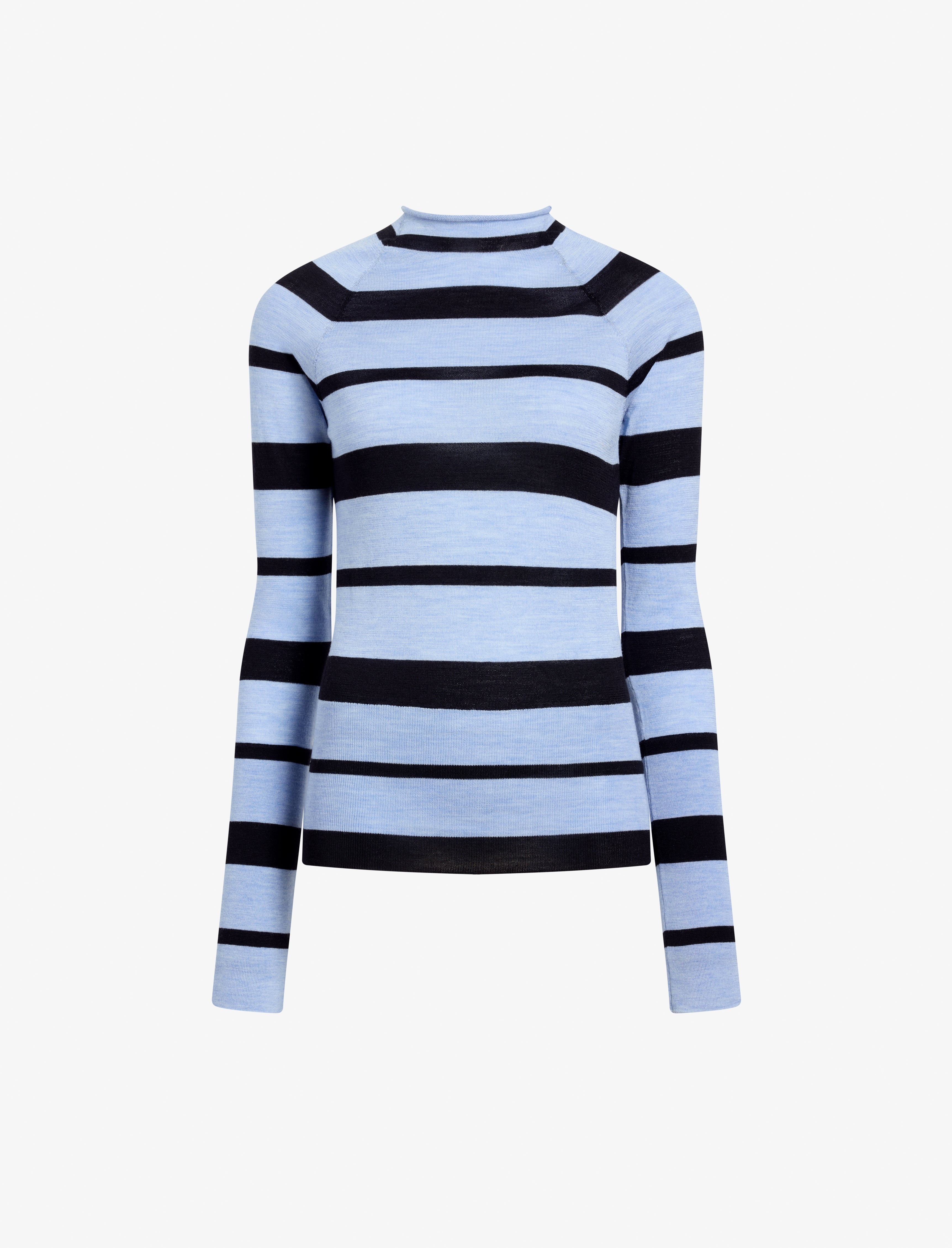 The Gia Top in Superfine Merino Silk is crafted to a slim silhouette with a high rolled neckline and contrast stripe pattern. Details - Blue multi - High roll neck - Long sleeves - Straight hem - Slim fit - 71% wool, 29% silk - SKU: R2537260KW158963 Size & Fit - Model is 5'11'' with 30'' bust / 35.5'' hips. Wearing size Small Care - 71% wool, 29% silk - Dry clean only