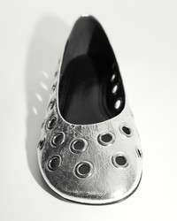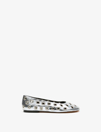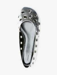 The Glove Grommet Flats in Crinkled Metallic are crafted in crinkled leather to a slip-on silhouette with a round toe and low stacked heel. Features metal grommet studs along the upper. Details - Silver - Crinkled metallic leather - Slip-on silhouette - Low stacked heel - Rounded toe - Silver-tone grommets - Upper: 100% goatskin; Sole: 100% calfskin - SKU: SH252043BX008FC041 Size & Fit - True to size Care - Upper: 100% goatskin; Sole: 100% calfskin - Please refer to care instructions provided with your order.