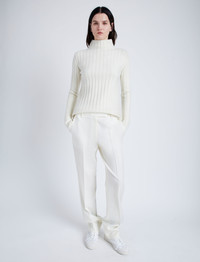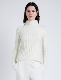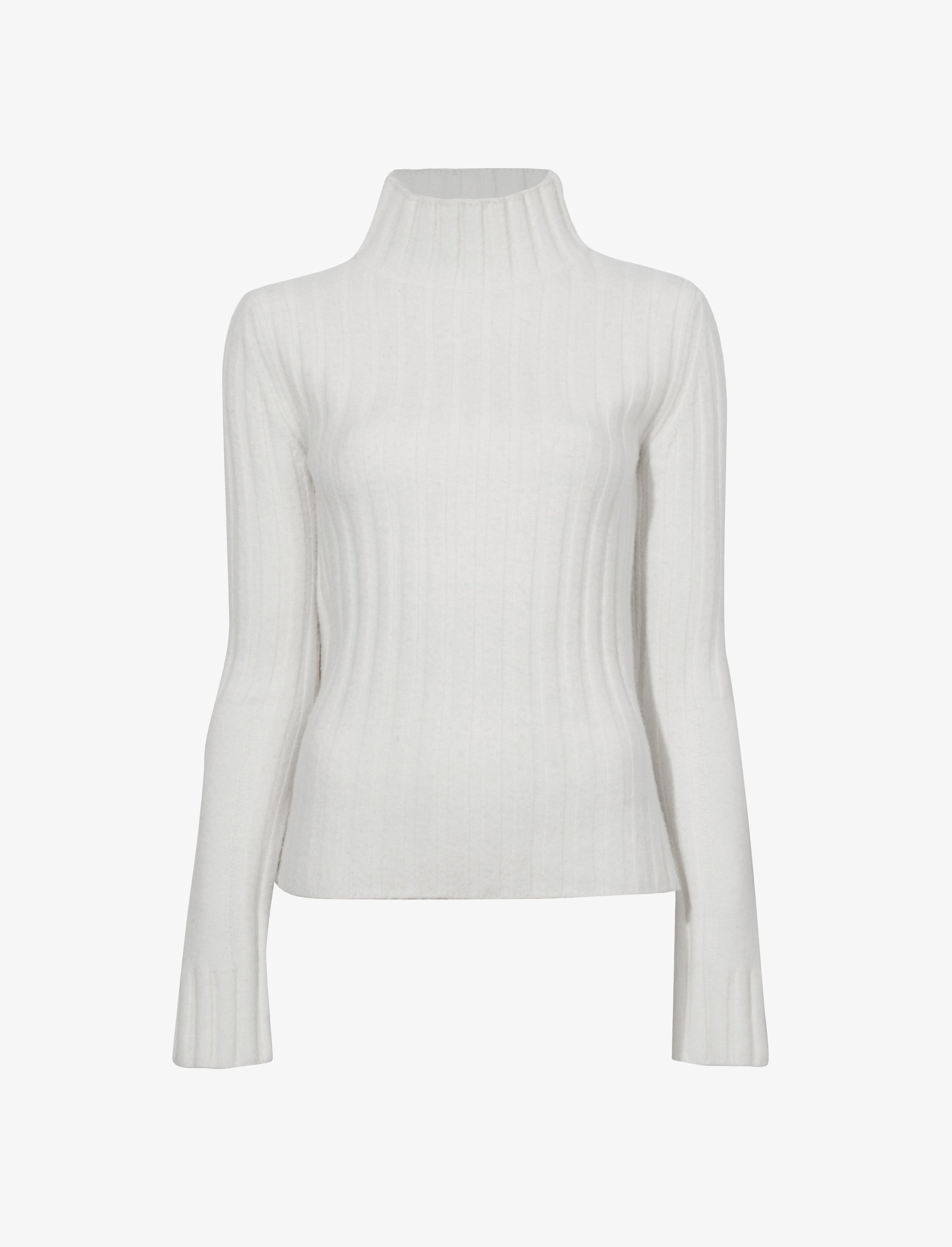 The Haven Sweater in Midweight Cashmere Rib features a slim silhouette with a high neckline. Finished with a curved lower-back panel. Details - Bone - High neck - Long sleeve - Curved back band - Slim fit - 52% merino wool, 31% nylon, 11% cashmere, 6% spandex - SKU: R2447193KW163123 Size & Fit - Model is 5'10'' with 31.5'' bust / 34'' hips. Wearing size Small Care - 52% merino wool, 31% nylon, 11% cashmere, 6% spandex - Dry clean only