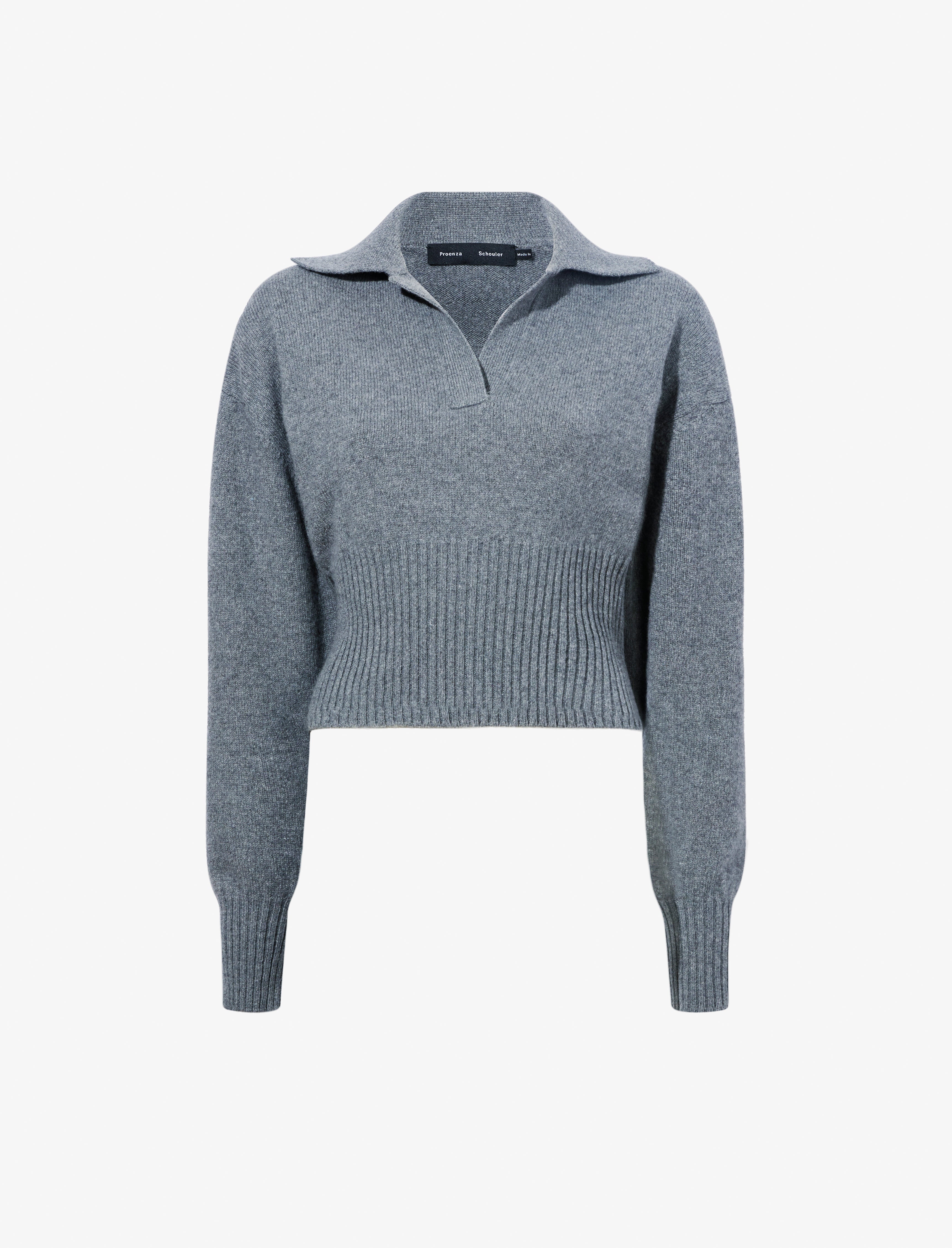 Core Collection The Jeanne Sweater in Eco Cashmere is spun from plush cashmere yarn for a soft handle. Featuring a spread collar, long balloon sleeves and a sculpted ribbed-knit waist. Details • Grey Melange • Spread collar • V-neck • Long balloon sleeves • Ribbed-knit trims • Straight hem • 97% sustainable cashmere, 3% wool • SKU: R2417125KW152031 Size & Fit • Model is 5'11'' with 32'' bust / 35'' hips. Wearing size Small Care • 97% sustainable cashmere, 3% wool • Dry clean only