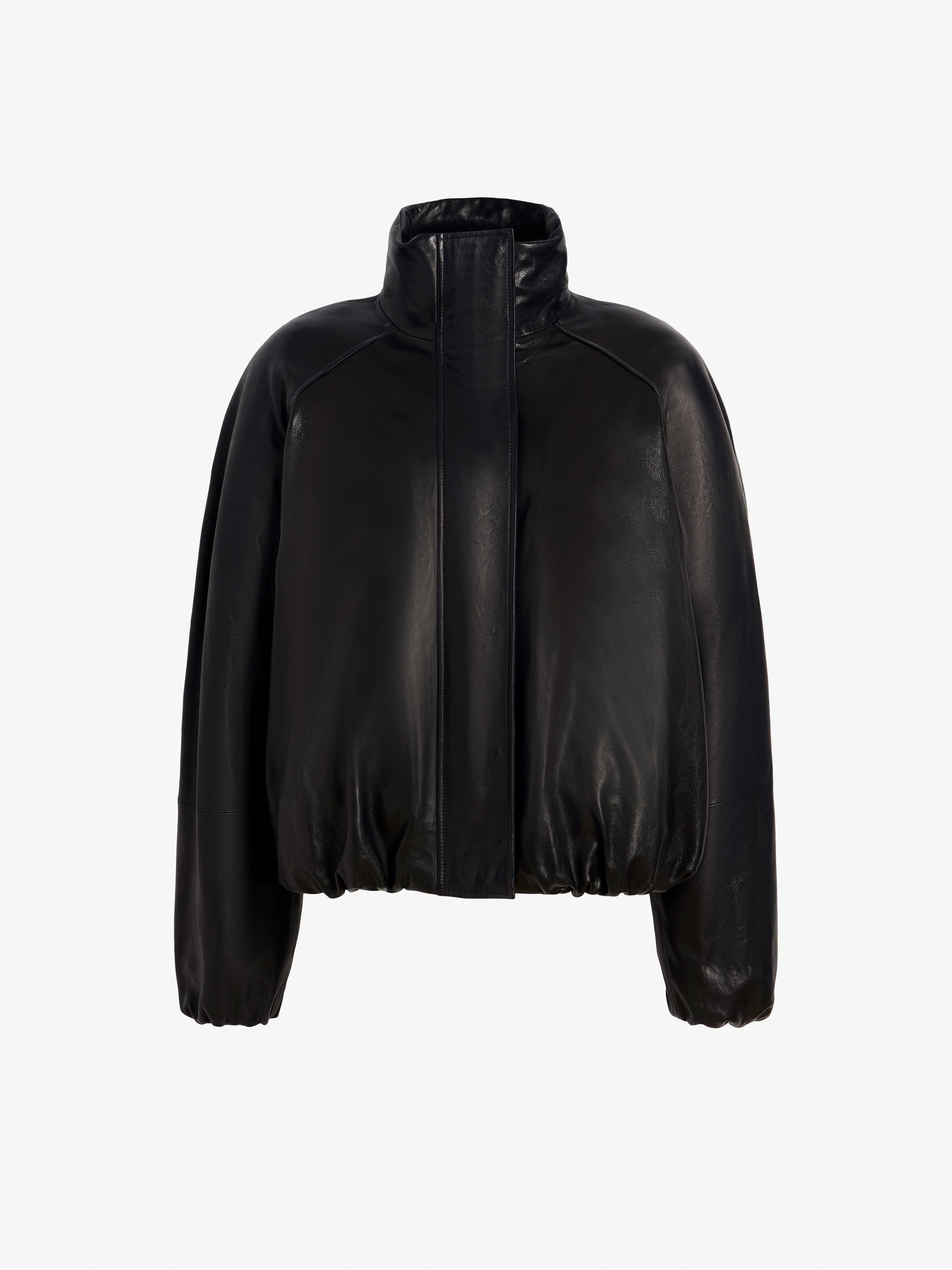 The Laney Jacket in Semigloss Leather features a plush silhouette with a stand collar and gathered bubble hem. Slip pockets detail the sides, while a concealed zipper with snap closures secures the jacket. Details - Black - Water resistant - Stand collar - Long sleeves - Zipper front - Snap closures - Slip pockets - Bubble hem - Relaxed fit - Fully lined - 100% sheepskin - SKU: R2542001LR280B001 Size & Fit - Model is 5'11'' with 30'' bust / 35.5'' hips. Wearing size 4 Care - 100% sheepskin - Spot clean only