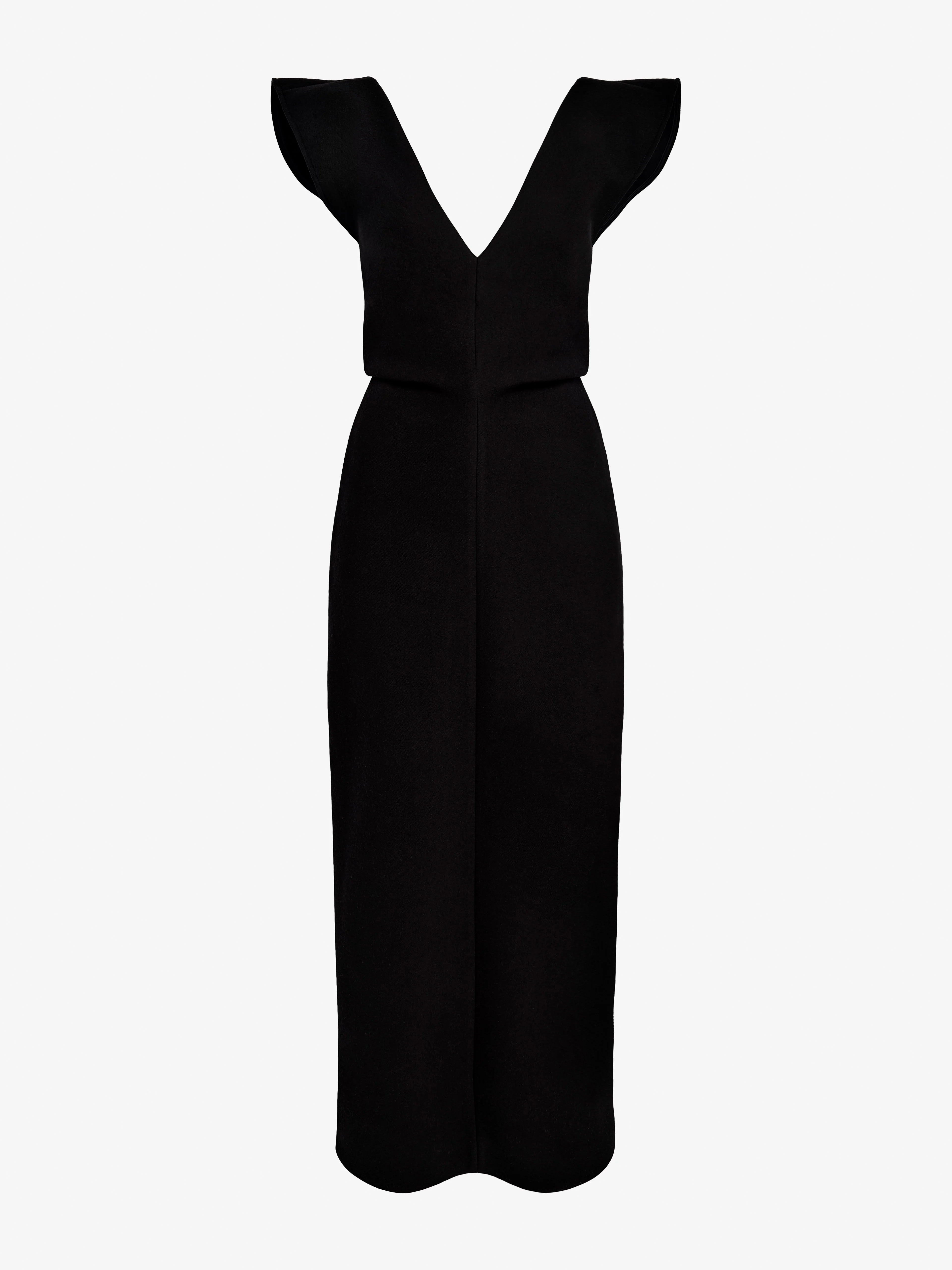 The Mariam Dress in Wool Scuba is crafted to a slim silhouette, featuring a V-neck at both the front and back. Finished with a structured flare at the sleeves. Details - Black - V-neck at front and back - Flared sleeves - Draped waistline - Concealed zipper fastening - Slim silhouette - 87% viscose, 13% wool - SKU: R2613008AY212Y001 Size & Fit - Model is 5'10'' with 32'' bust / 34'' hips. Wearing size 4 Care - 87% viscose, 13% wool - Dry clean only
