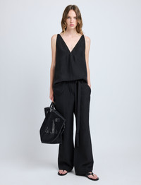 The Mitchell Top in Cotton Viscose Linen is crafted to a relaxed V-cut tank with slim shoulder straps and side slits. Details - Black - V-neckline - Slim shoulder straps - Side slits - Straight hem - Relaxed fit - 51% viscose, 26% linen, 23% cotton - SKU: R2534002BY330001 Size & Fit - Model is 5'9.5'' with 32'' bust / 34'' hips. Wearing size 4 Care - 51% viscose, 26% linen, 23% cotton - Dry clean only