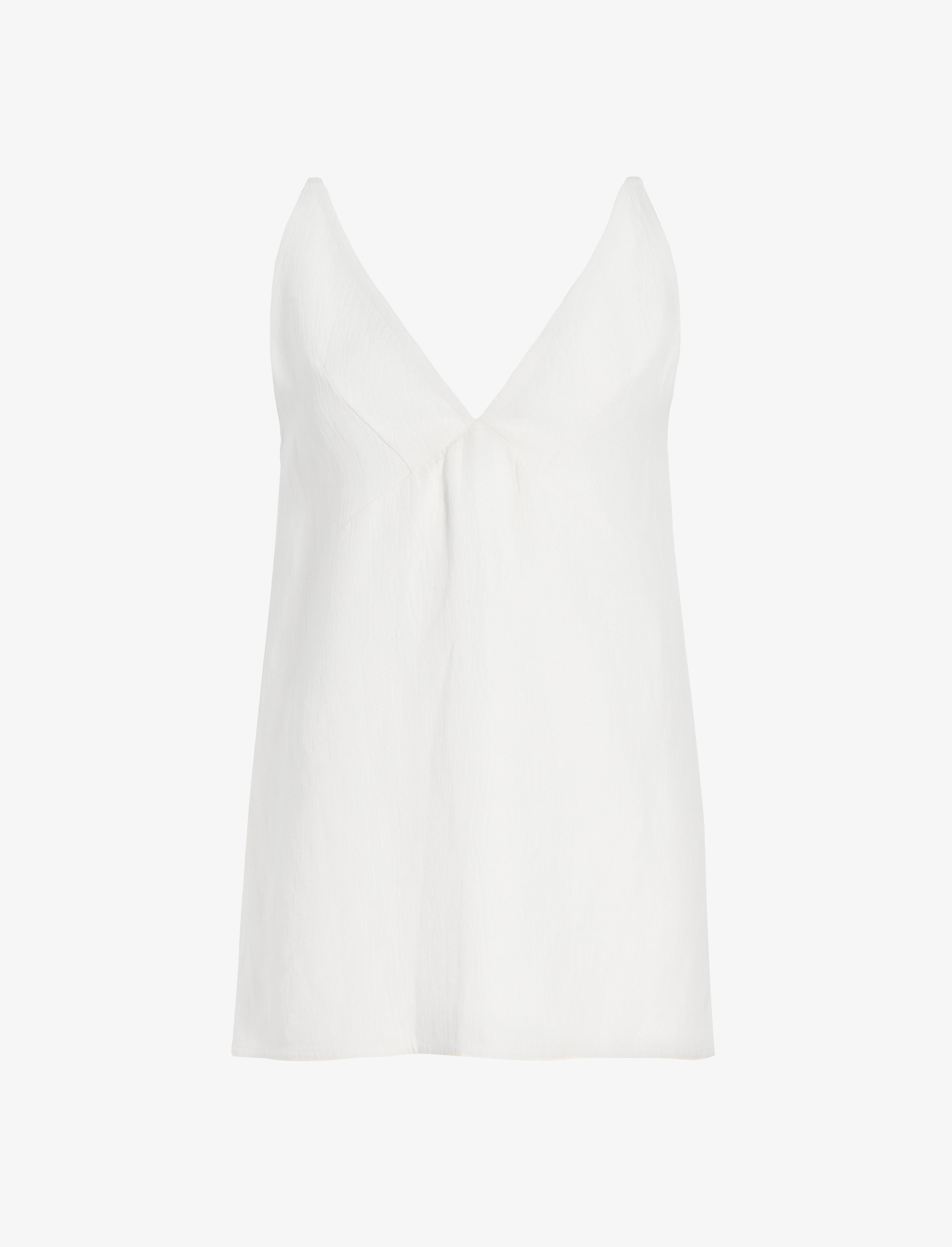 The Mitchell Top in Cotton Viscose Linen is crafted to a relaxed V-cut tank with slim shoulder straps and side slits. Details - Ecru - V-neckline - Slim shoulder straps - Side slits - Straight hem - Relaxed fit - 51% viscose, 26% linen, 23% cotton - SKU: R2534002BY330103 Size & Fit - Model is 5'9.5'' with 32'' bust / 34'' hips. Wearing size 5 Care - 51% viscose, 26% linen, 23% cotton - Dry clean only