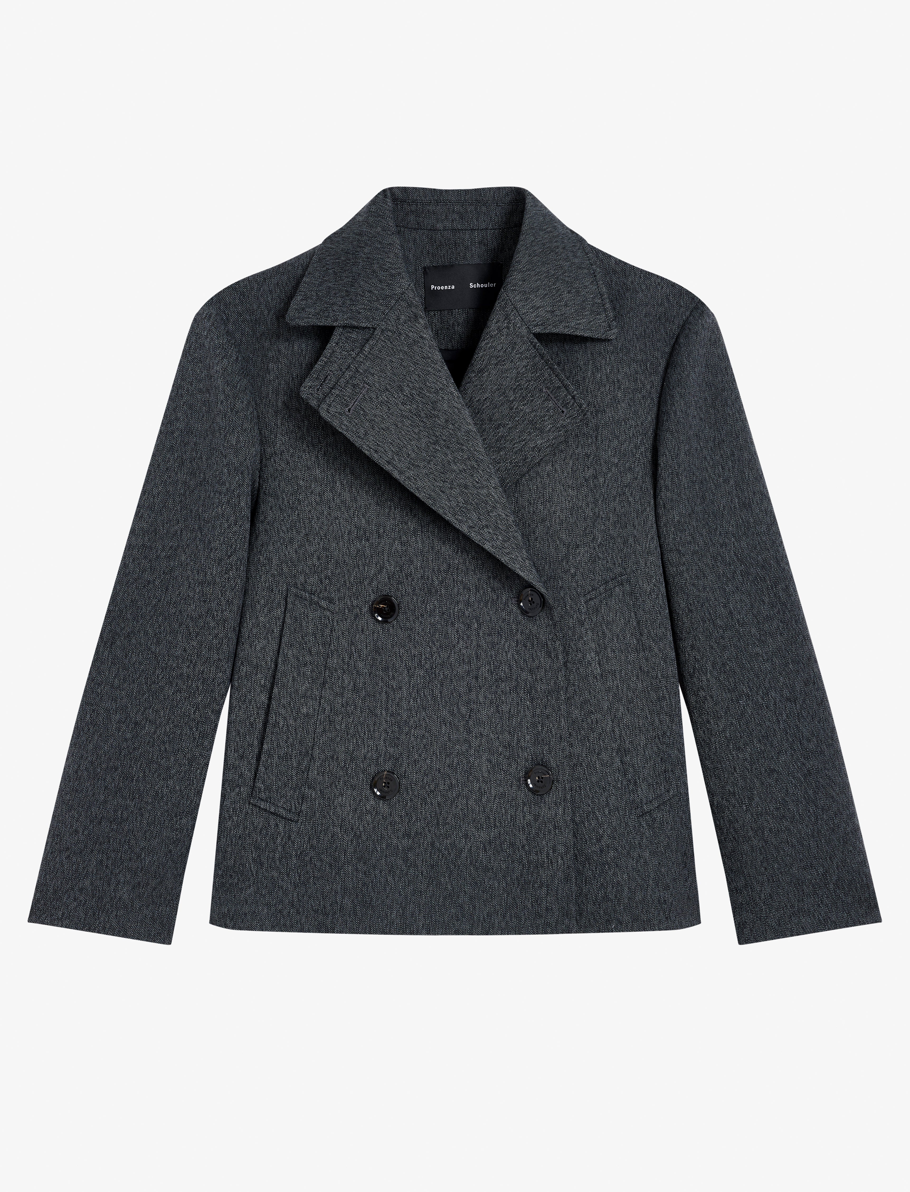 The Nola Jacket in Textured Suiting is tailored to a cropped trench silhouette, featuring notch lapels that can be styled as a stand collar when fastened with a removable storm guard at the neck. Finished with side welt pockets. Details - Charcoal melange - Peak lapels - Removable storm guard - Long sleeves - Triple-breasted closure - Side welt pockets - Back neck loop - Lined - Straight hem - 54% polyester, 44% virgin wool, 2% elastane - SKU: R2532001AY207983 Size & Fit - Model is 5'9.5'' with 32'' bust / 34'' hips. Wearing size 4 Care - 54% polyester, 44% virgin wool, 2% elastane - Dry clean only