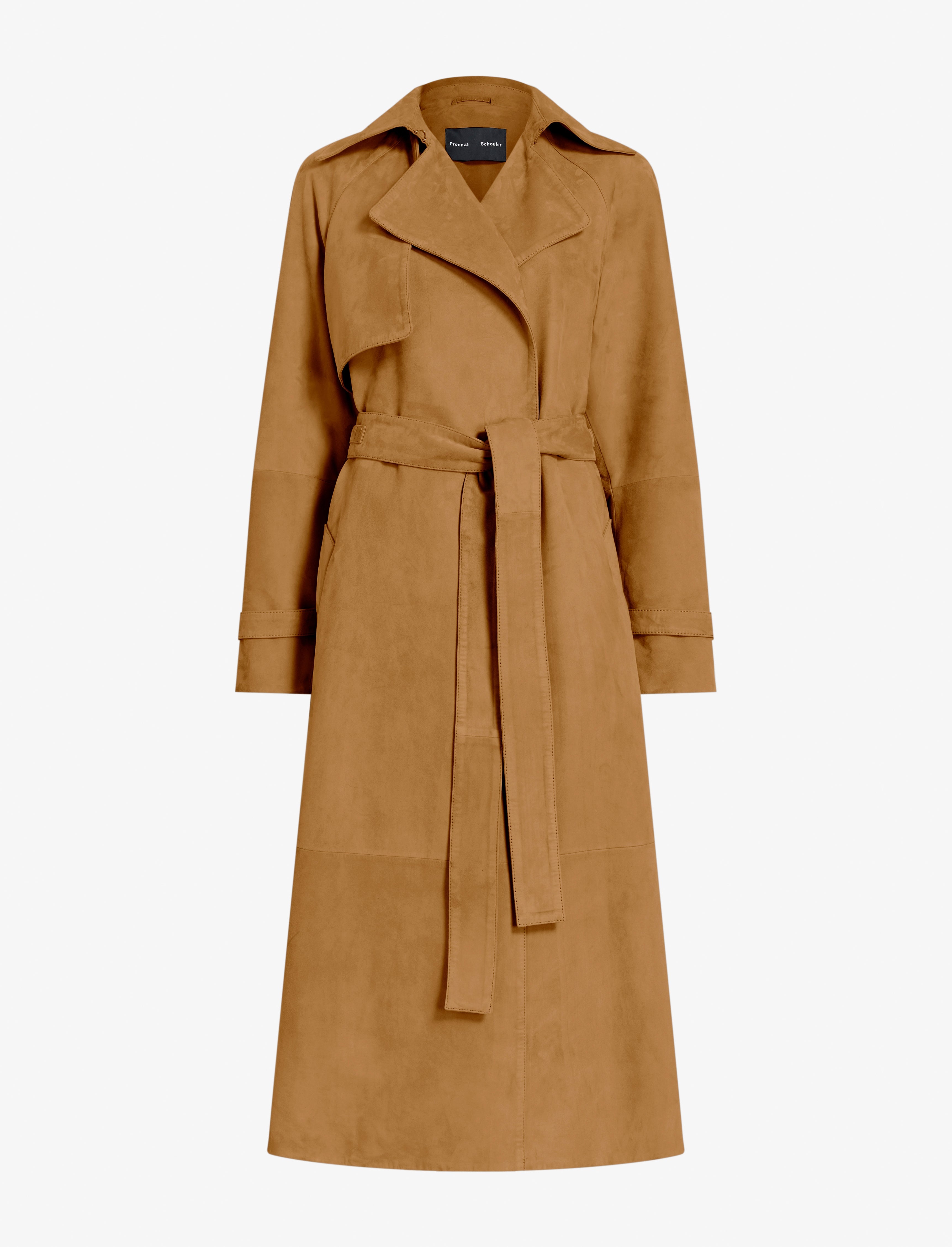 The Ramona Coat in Suede is cut to a longline silhouette with a self-tie waist belt. Finished with a structured collar secured by a metal hook and bar, tortoise buttons at the sleeve tabs, and side welt pockets. Details - Pony - Notch lapels - Metal hook and bar at collar stand - Storm flap - Tortoise buttons - Self-tie belt - Welt pockets - Back vent - Trench silhouette - Lined - 100% lambskin - SKU: R2531000LR278A239 Size & Fit - Model is 5'10'' with 31'' bust / 34.5'' hips. Wearing size 4 Care - 100% lambskin - Dry clean only