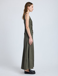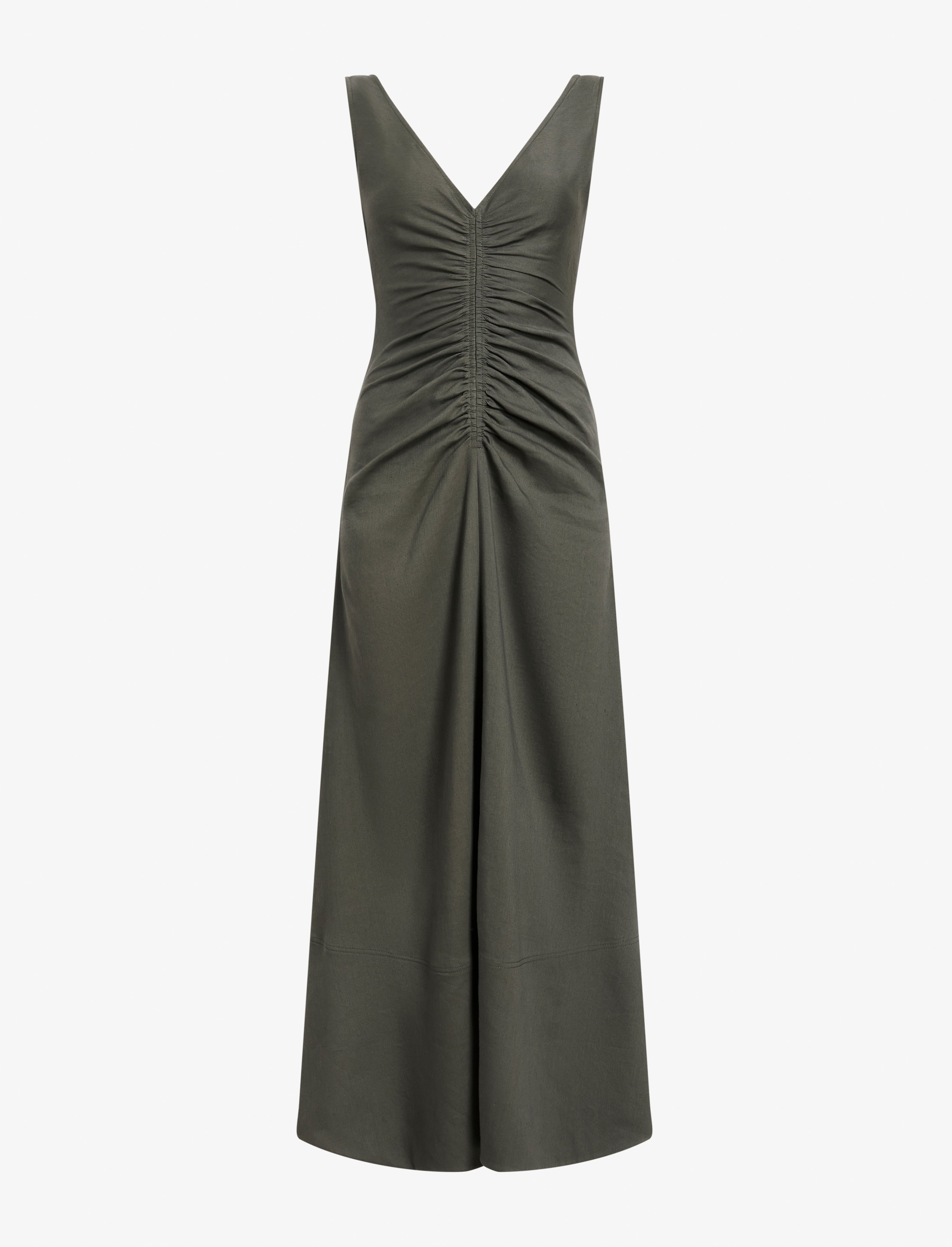 The Remi Dress in Eco Stretch Linen Viscose is crafted to a gently flared silhouette, featuring a deep V-neckline and ruched detailing through the center front and back. Details - Fatigue - V-neckline - Sleeveless - Ruched center - Ankle-length hem - Slim fit - 66% organic linen, 32% viscose, 2% elastane - SKU: R2533014BL001E310 Size & Fit - Model is 5'9.5'' with 32'' bust / 34'' hips. Wearing size 4 Care - 66% organic linen, 32% viscose, 2% elastane - Dry clean only