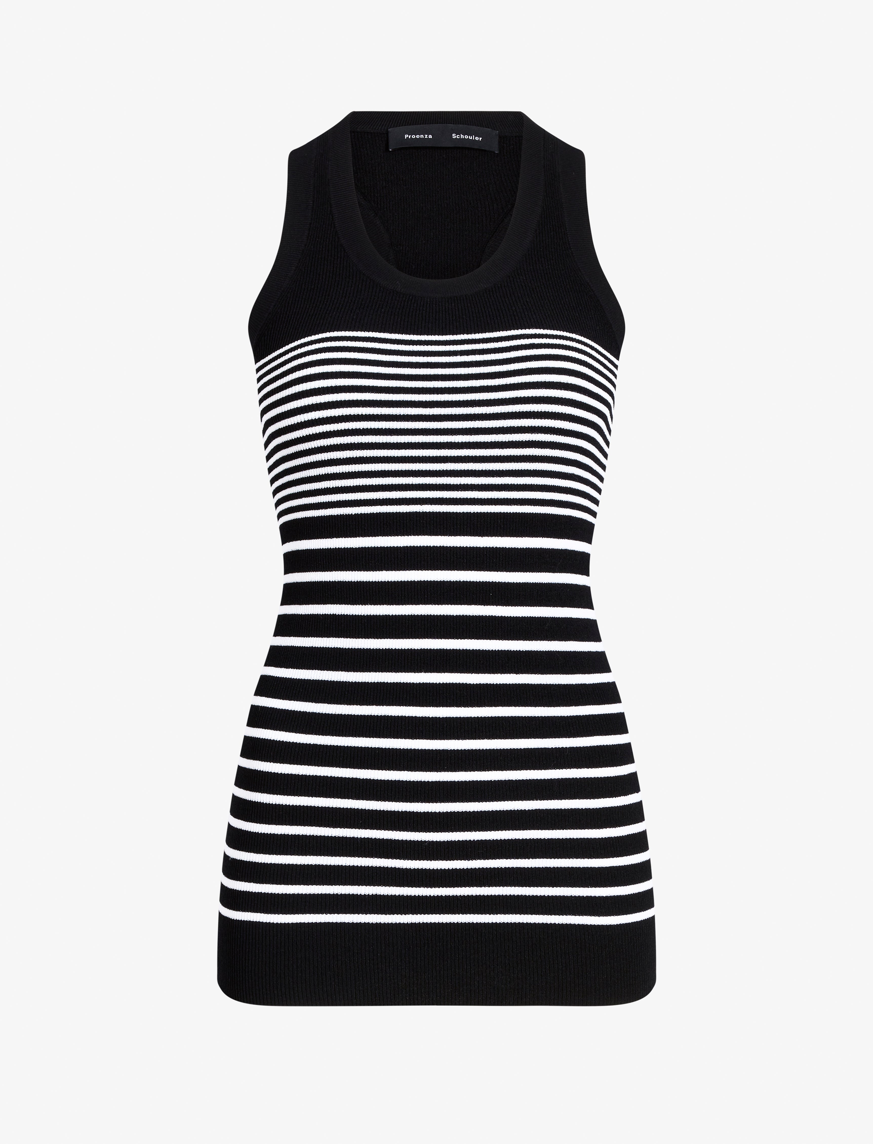 The Roberts Knit Tank in Matte Viscose Rib is rib-knitted to a slim striped silhouette and features a racerback. Details - Black multi - Stripe pattern - Ribbed knit - Scoop neckline - Sleeveless - Racerback - Straight hem - Slim fit - 81% viscose, 19% polyester - SKU: R2537243KY283002 Size & Fit - Model is 5'9.5'' with 32'' bust / 34'' hips. Wearing size Small Care - 81% viscose, 19% polyester - Dry clean only
